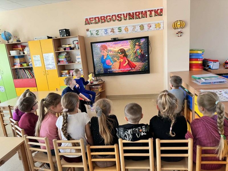 Mažieji dalyviai klausėsi edukacinės pasakos „Tutis Išlaidutis ir Investicinė pupa“ (I ir II dalys), kuri žaismingai supažindino su taupymo, išlaidų planavimo ir atsakingo pinigų naudojimo pagrindais.