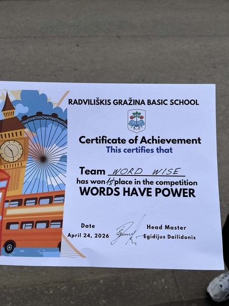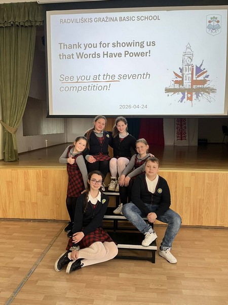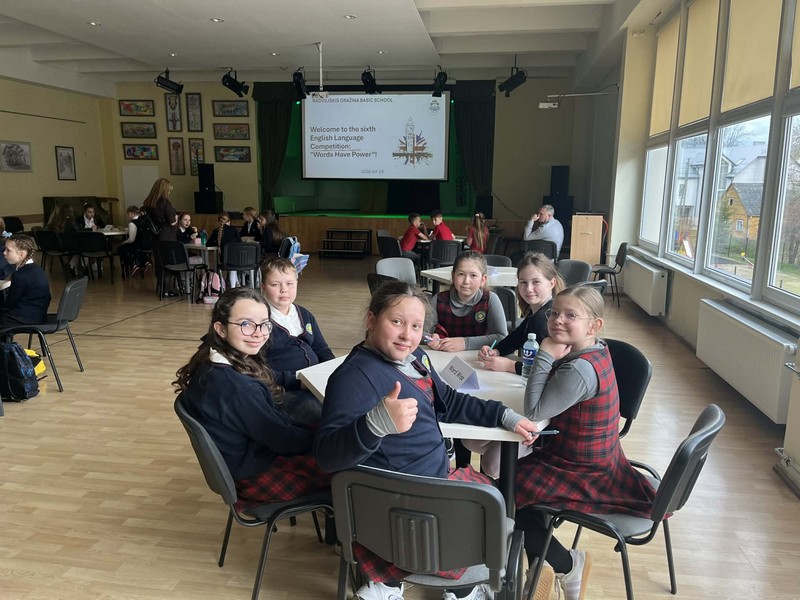 Balandžio 24d. mūsų mokyklos 4a ir 4b klasių mokinių komanda (Vakaris Šandaris, Kornelija Krutoguzenko, Elzė Burdaitė, Urtė Jankauskaitė, Lelija Astrauskaitė, Mėta Jankūnaitė) su mokytoja Agne Kiliene dalyvavo tarptautinėse ketvirtų klasių anglų kalbos varžytuvėse „Words Have Power“, vykusiose Gražinos pagrindinėje mokykloje. Renginyje savo jėgas išbandė net septynios komandos, tarp jų – dvi komandos iš Latvijos.